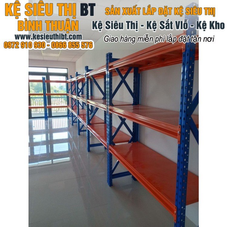 Kệ siêu thị Bình Thuận là đơn vị sản xuất và phân phối Cung cấp tất cả các loại giá kệ & thiết bị cho kho hàng, siêu thị. Chúng tôi có tất cả các loại kệ kho hàng, kệ siêu thị đáp ứng mọi nhu cầu khách hàng như kệ trung tải, kệ selective, kệ đơn, kệ đôi, kệ trưng bày, kệ quảng cáo, kệ tôn đột lỗ, kệ tôn liền, kệ giỏ mì, kệ kho…